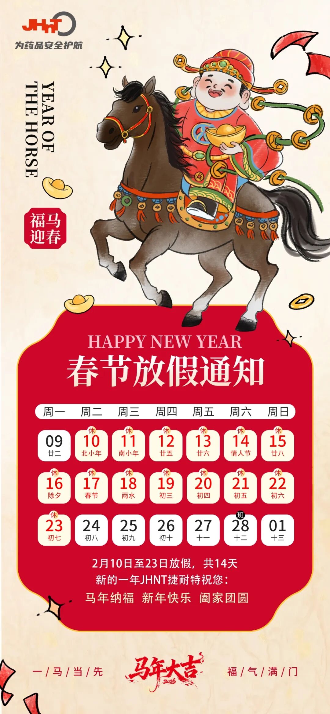 新春将至,万象更新。捷耐特全体同仁谨向一直关心与支持我们的您,致以最诚挚的祝福和衷心的感谢!祝您及家人在新的一年里,龙马精神、身体健康、阖家幸福、万事如意!